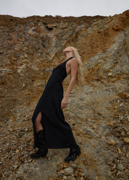 The 'Andy' halter maxi dress is made from lightweight hemp and tencel seersucker. Designed with a v-neck tie halter, low back, gathered centre front bodice, centre front hem split, and invisible centre back zip for easy wear and movement.