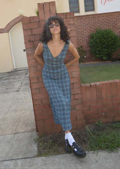 Our signature lightweight, breathable hemp tencel seersucker returns in the beloved navy check as part of our ongoing collection of refined shapes. This maxi dress is designed with a longline semi fitted silhouette, flattering v-neck and back, gathered bust for subtle shaping and removable waist tie that adjusts to flatter your figure.